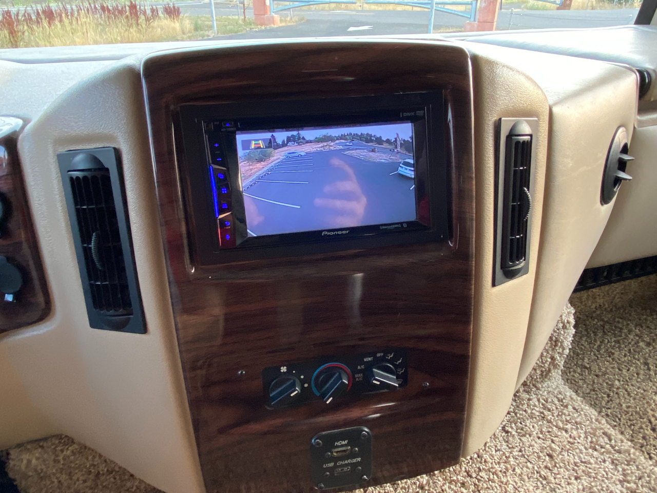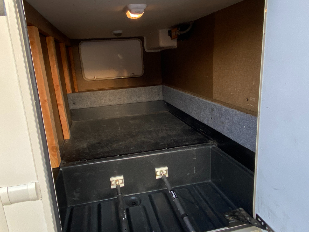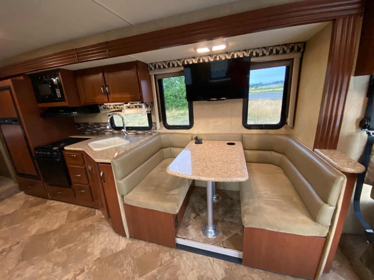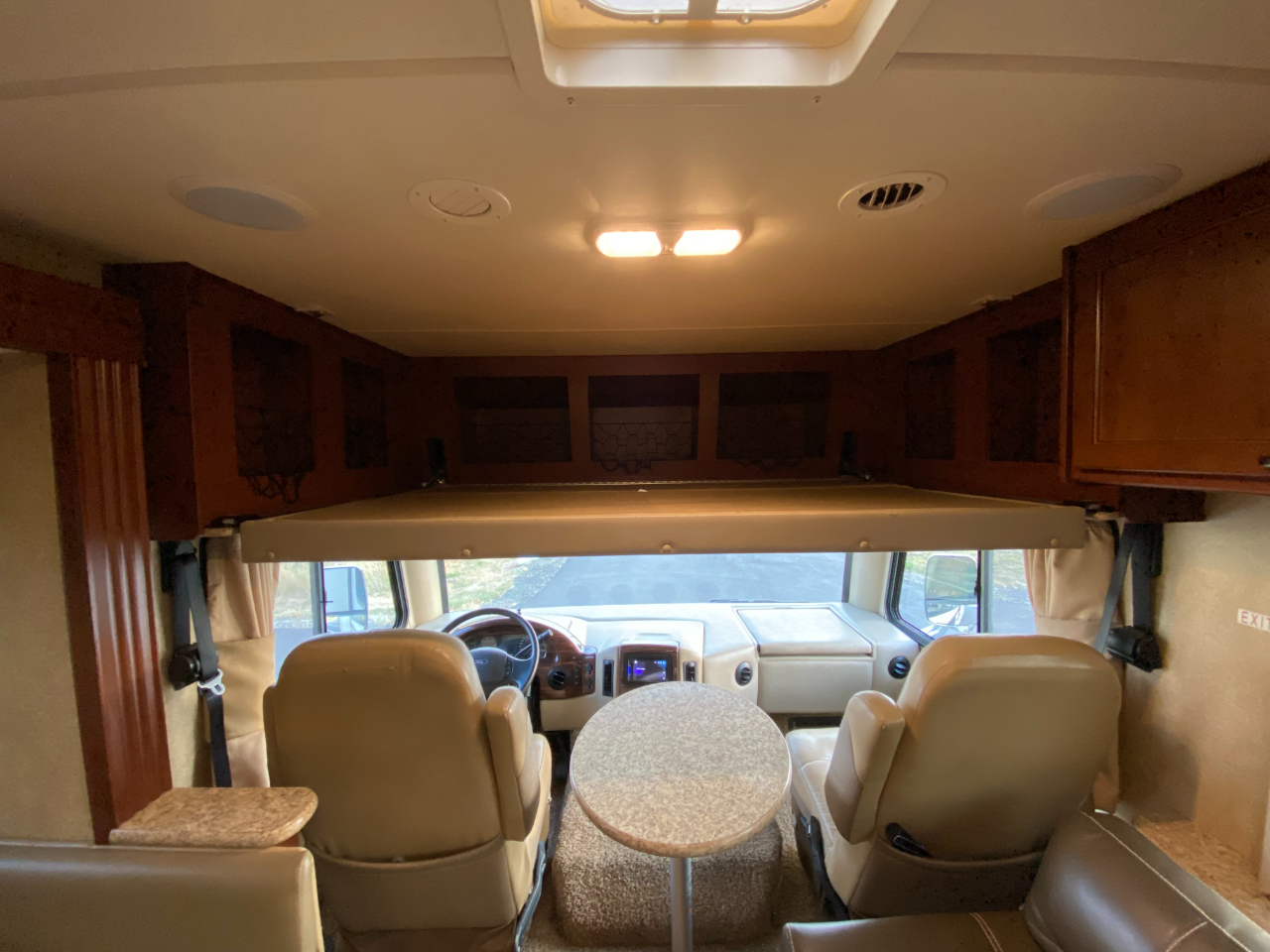 Across from the door there is a large booth, sofa with air bed as well as a pedestal table...the perfect place to enjoy your morning cup of Joe and the scenery of your choice out the window. This can also be made into extra sleeping space if needed at night. Plus, there is a drop-down overhead bunk above the cab seats and coffee table for more sleeping too.