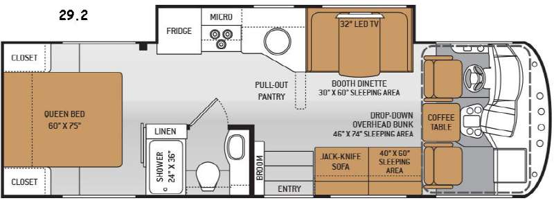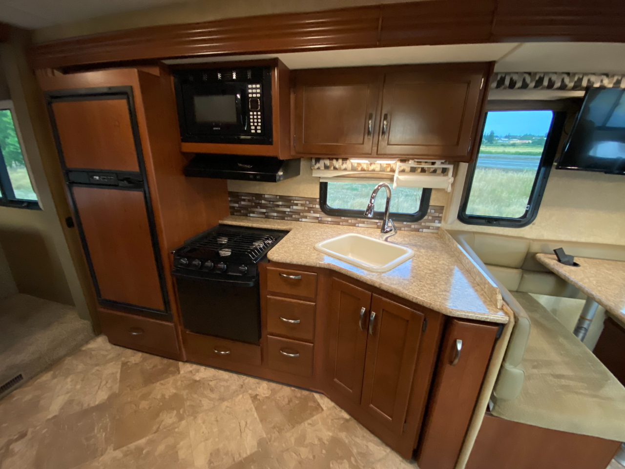 As you step inside model 29.2 you will see a pretty open interior with the passenger side slide fully extended. There is a three burner range with microwave oven just inside the door on your left, a counter area with round kitchen sink, and refrigerator with pull-out pantry next to it. All of this allows you to easily cook food while you are away from home.