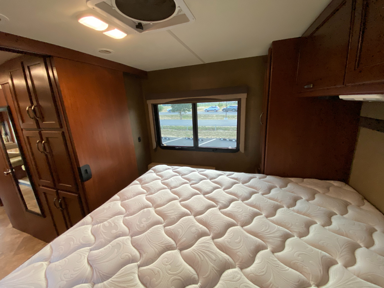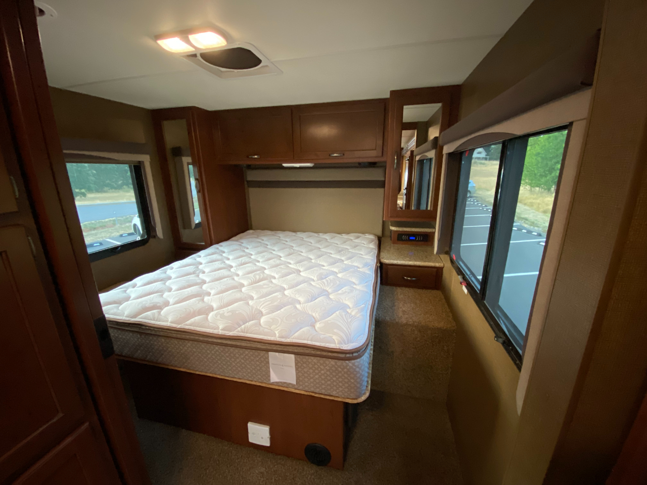 A sliding door takes you into the spacious rear bedroom with a king bed within a slide (continuing the curb side slide) along with nightstands and overhead cabinets. There are closets and drawers opposite the bed and so much more!