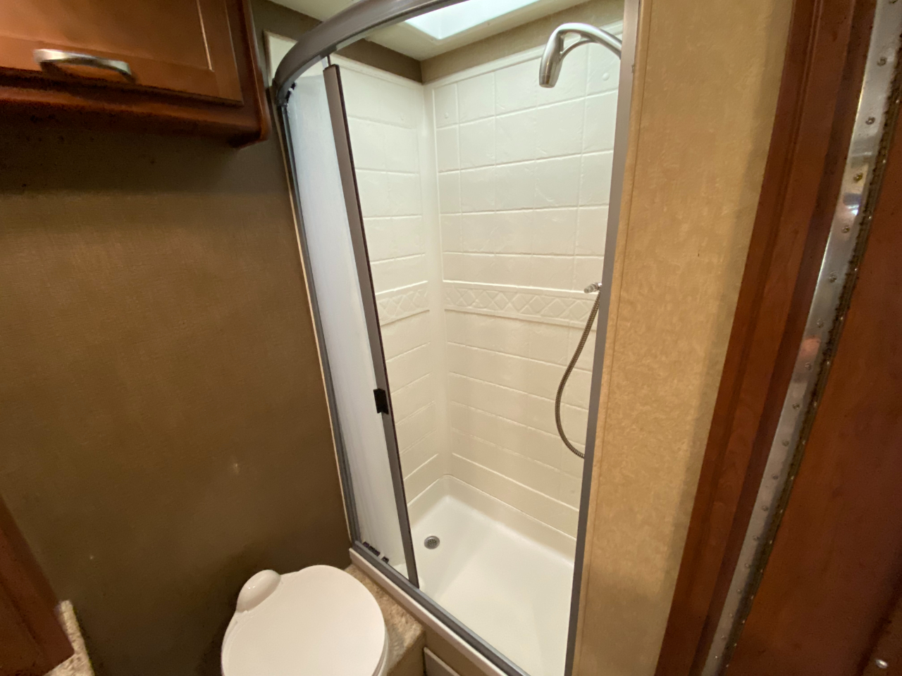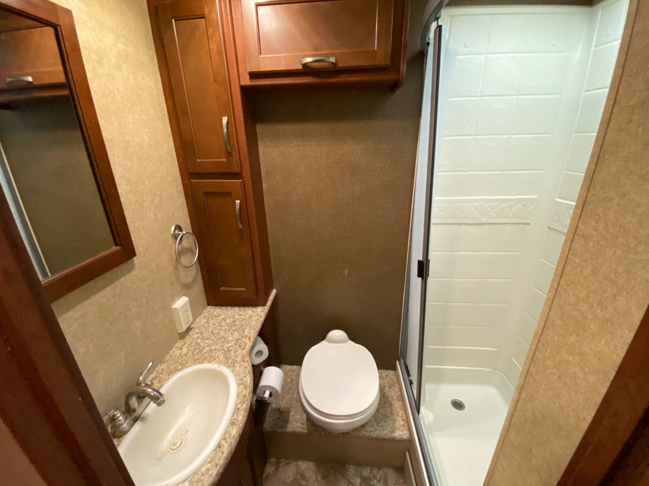 The bath features a shower, toilet, and vanity with sink as well as overhead storage. There is also a linen cabinet just outside the bath door.